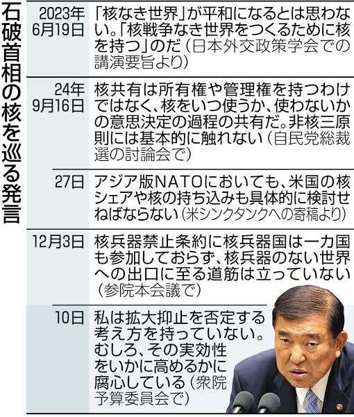 これについて石破前首相は20日生出演した番組で「(発言は)誰が言ったかわからず、個人的な見解をオフレコで言っている」とした上で、「我が国が核を持てばNPT(核拡散防止条約)やIAEA(国際原子力機関)からも出て行かないといけなくなる」と述べ、「何よりも日本のエネルギーを支えている原子力政策が成り立たなくなる」と指摘しました。