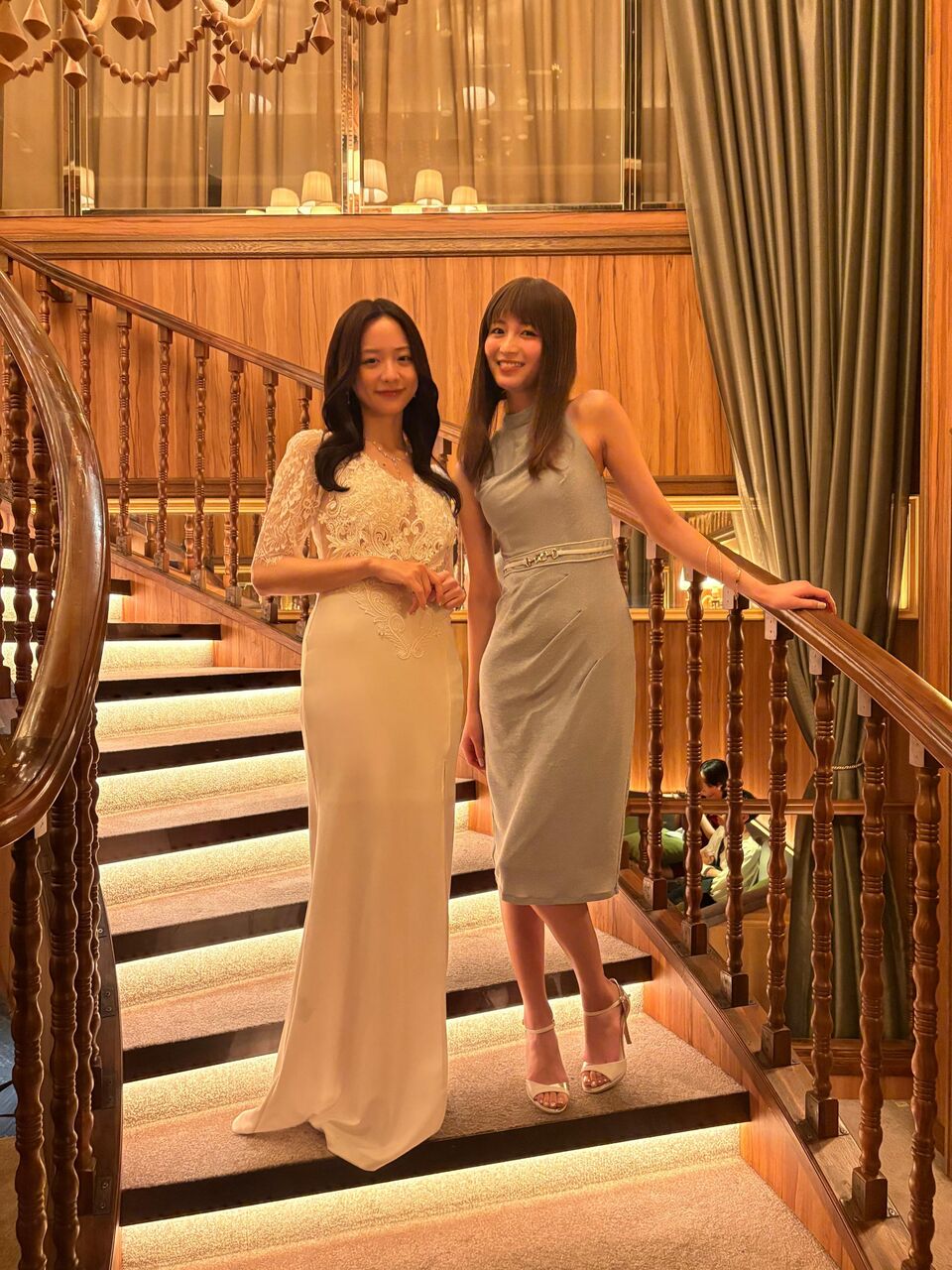 一方の森さんは、上半身に繊細なレースがあしらわれた真っ白なロングドレスを着用。ウェーブのかかった黒髪と穏やかな微笑みで、エレガントな空気をまとっています。