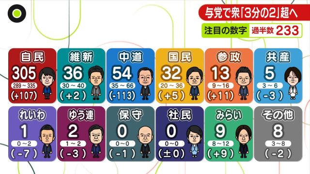 これに対し野党側は、中道改革連合が選挙前の172議席から大幅に減らし、半分程度にとどまる情勢です。参政党とチームみらいは2桁の議席を確保する可能性があります。