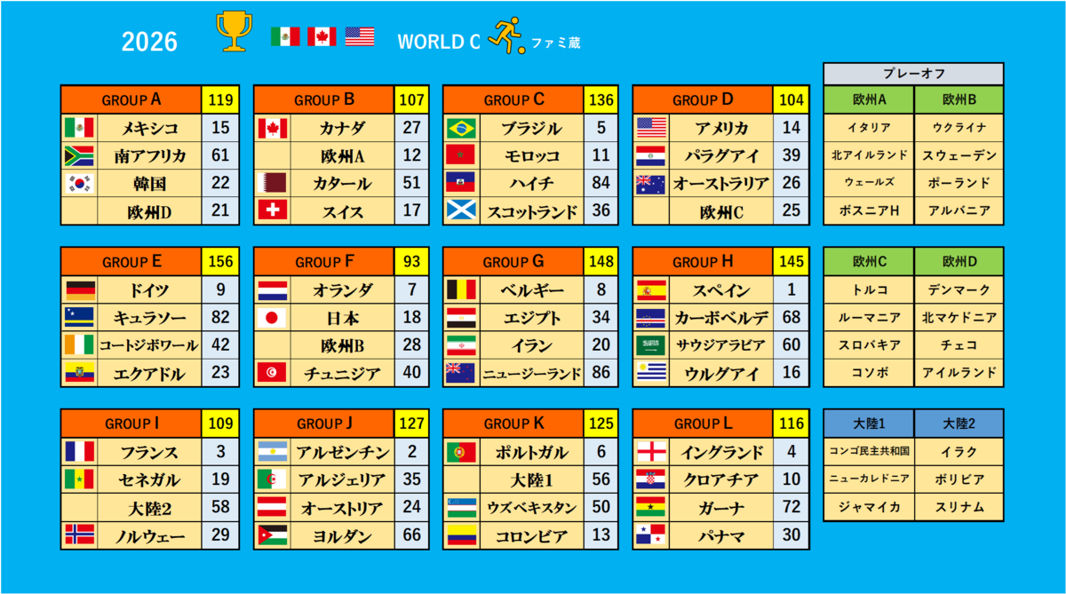 アメリカ、カナダ、メキシコの3カ国共催となる通算23度目のW杯。今大会は参加チームがこれまでの32カ国から48カ国に拡大され、2026年6月11日から同7月19日にかけて開催される。