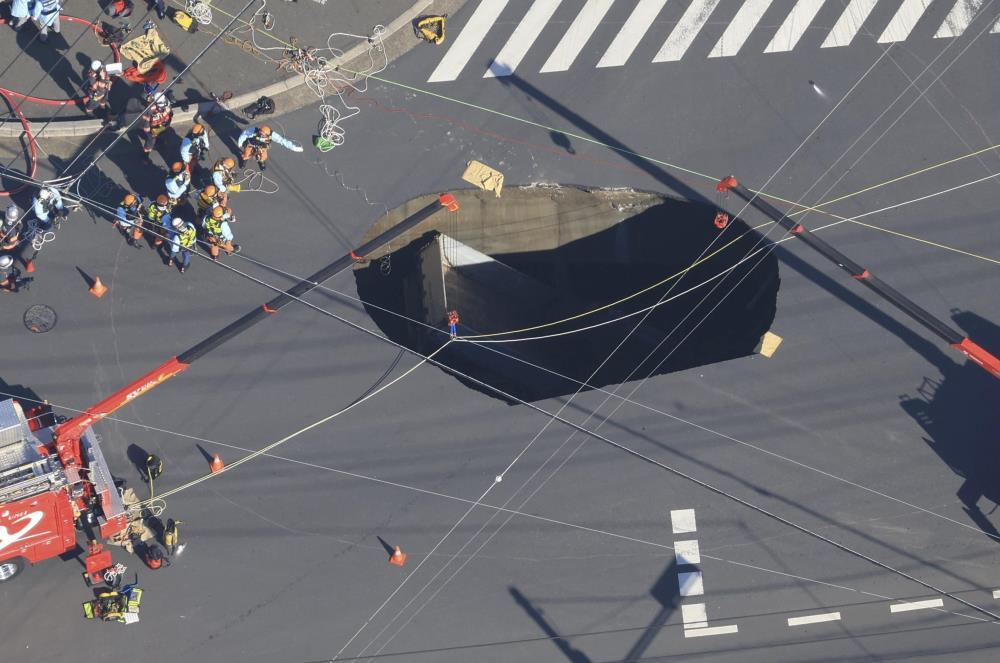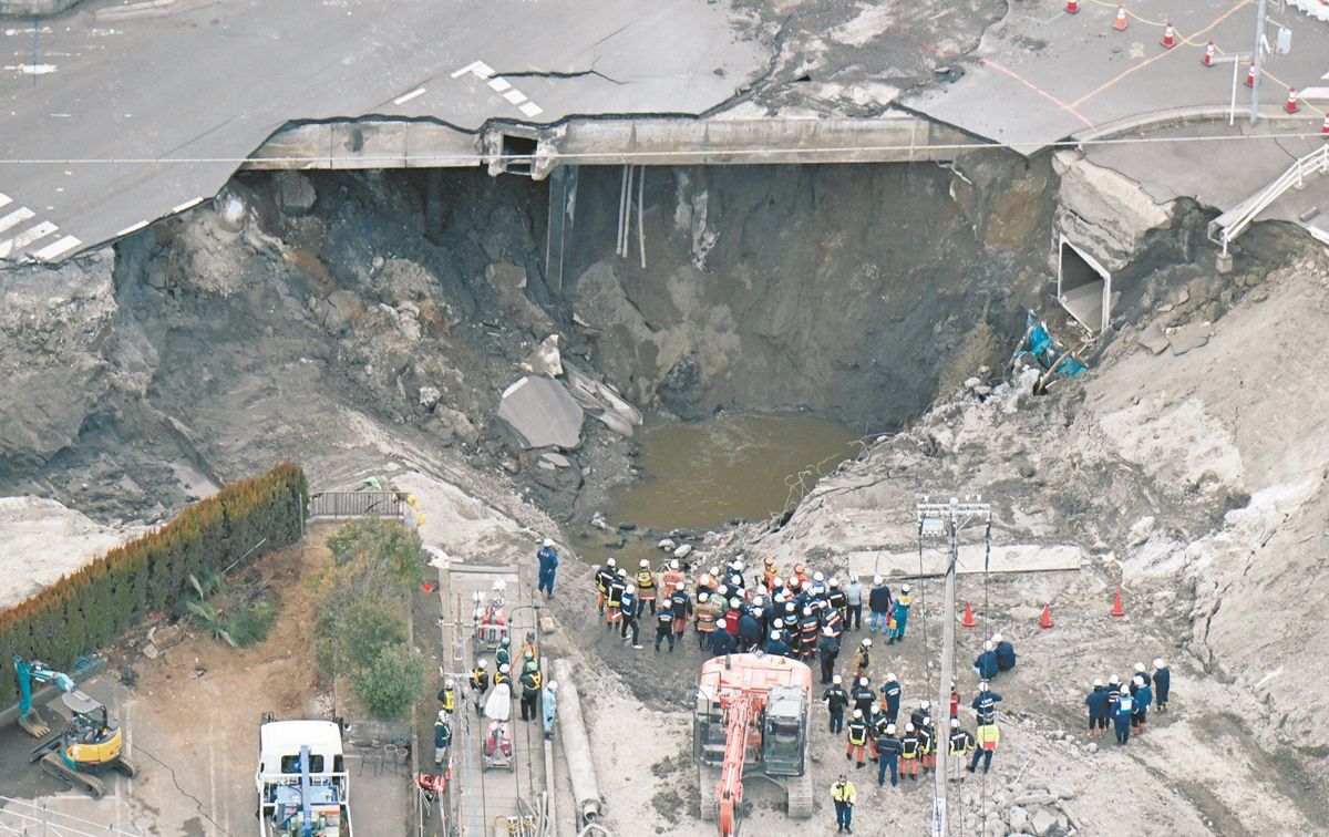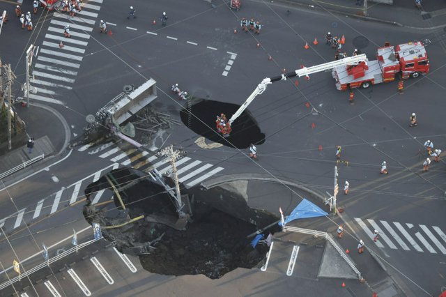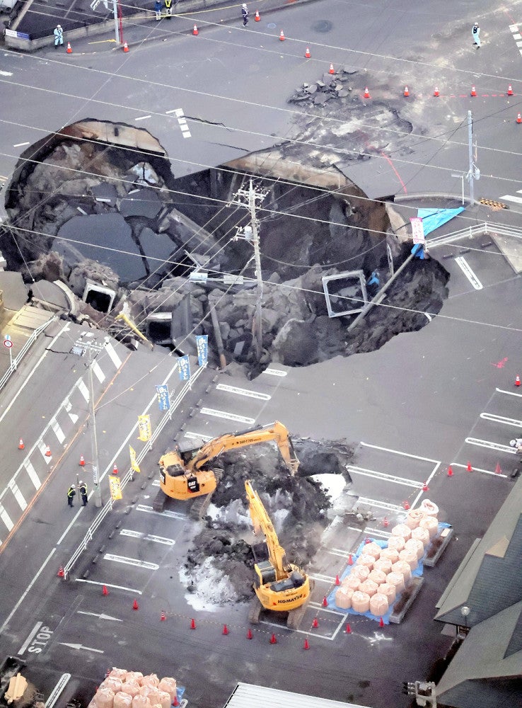 「交差点の一部分が突然陥没し、走行中だったトラックがブレーキを踏む間もなく、正面から突っ込むような形でほぼ垂直に転落しました。地中約15mを走る下水道管の、腐食による破損が原因とみられています」(消防関係者)