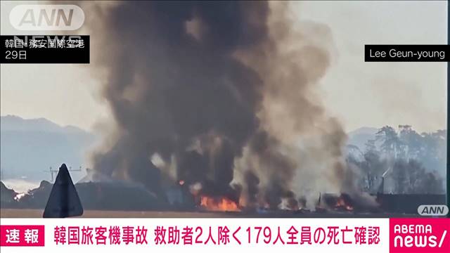 【務安聯合ニュース】韓国南西部の務安国際空港で29日、旅客機が着陸に失敗した事故で、乗員乗客181人のうち、179人の死亡が確認された。乗務員2人は救助された。