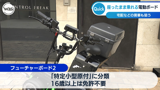 電動アシスト自転車などを製造販売するフューチャー(東京)は、免許不要で乗れる電動ボード「フューチャーボード2」を発売した。座ったまま運転できることから、配達や営業などでの利用を見込む。