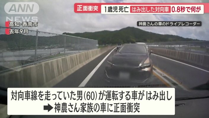 去年9月、高知県の自動車専用道路を走るドライブレコーダーの映像です。数台の車とすれ違ったその時、突然1台の車がセンターラインを越えて対向車線にはみ出してきたのです。対向車が車線をはみ出してから、衝突するまでの時間はわずか0.8秒。