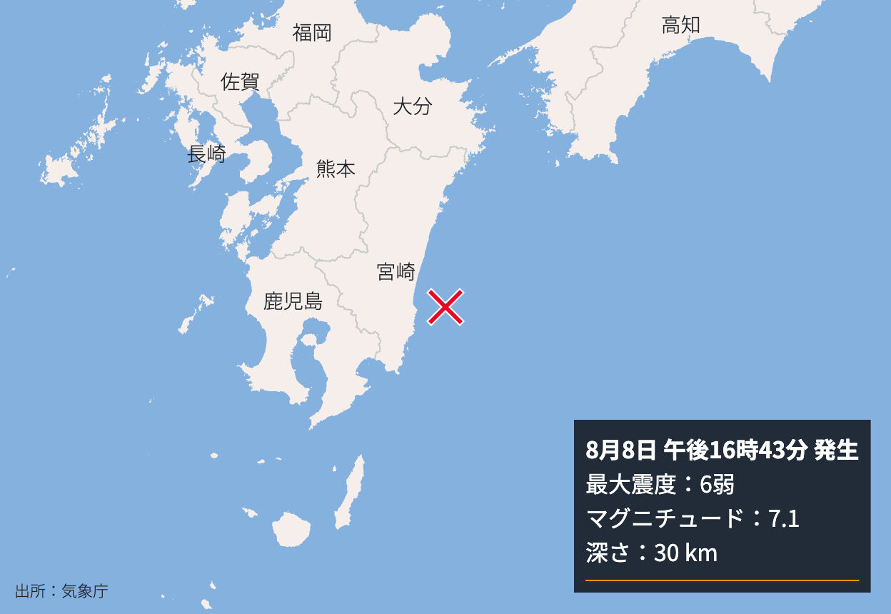 震源地は日向灘で震源の深さは31キロ、地震の規模を示すマグニチュードは7.1と推定されます。
